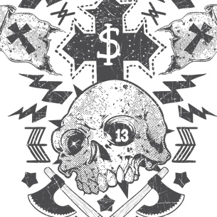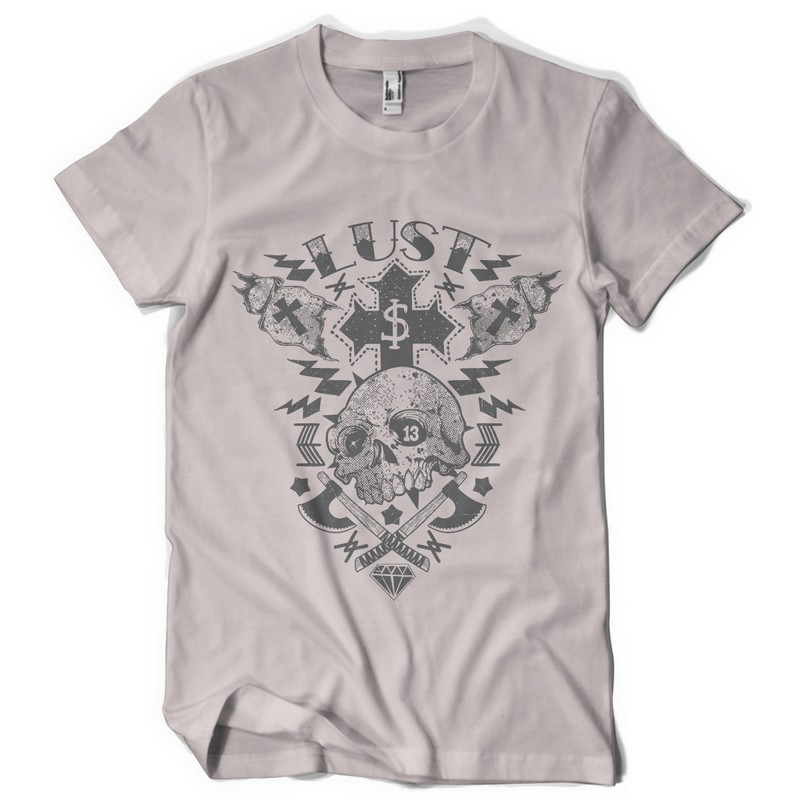 Lustful graphic design template in vector format, featuring detailed skull with axes now available for Adobe Illustrator, Adobe Photoshop and Corel Draw and can be used for digital printing and screenprinting .