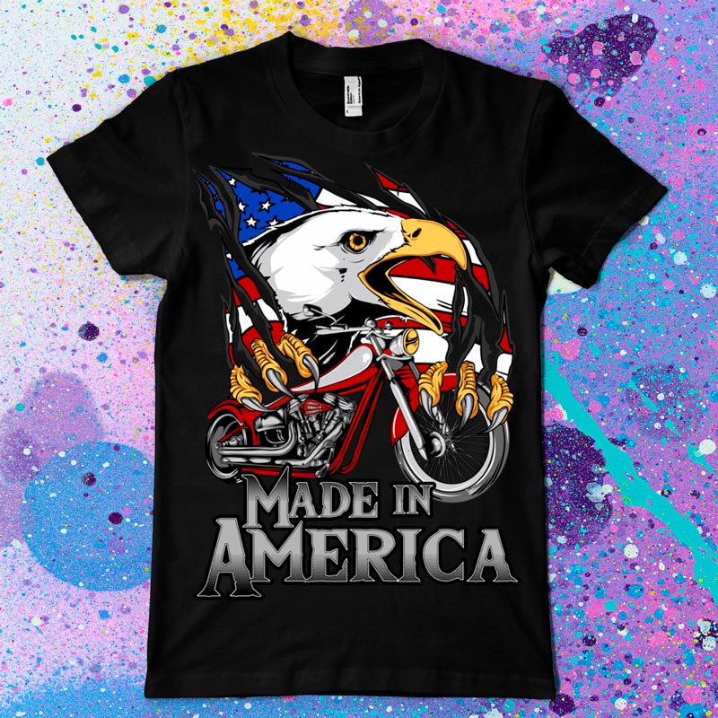 Made In America -shirt design features a Motorcycles design detailed screen print now available for Adobe Illustrator, Adobe Photoshop and can be used for digital printing and screenprinting.