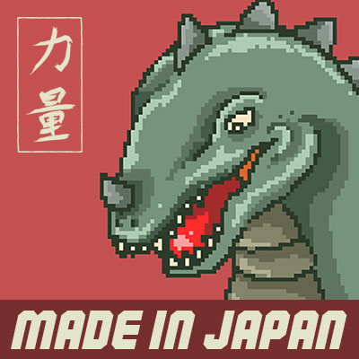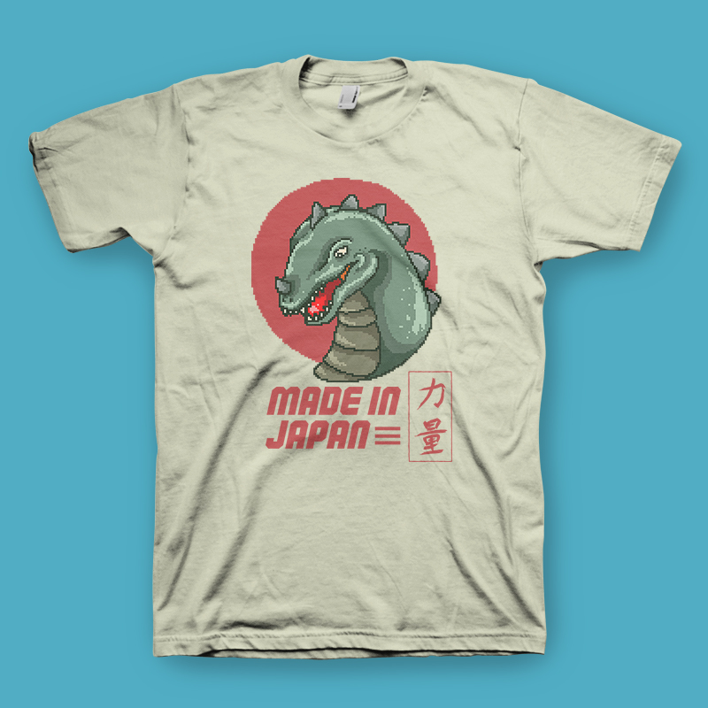 Made In Japan. Illustration of japanese popular monster giant dinosaur. The japanese word means strength. This design made with pixel art illustration.