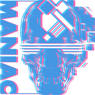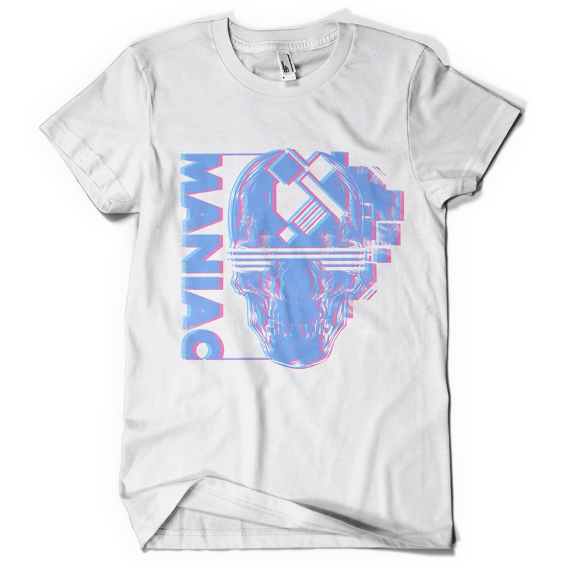 Maniac graphic design template in vector format, featuring detailed 3d skull now available for Adobe Illustrator, Adobe Photoshop and Corel Draw and can be used for digital printing and screenprinting .