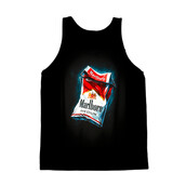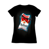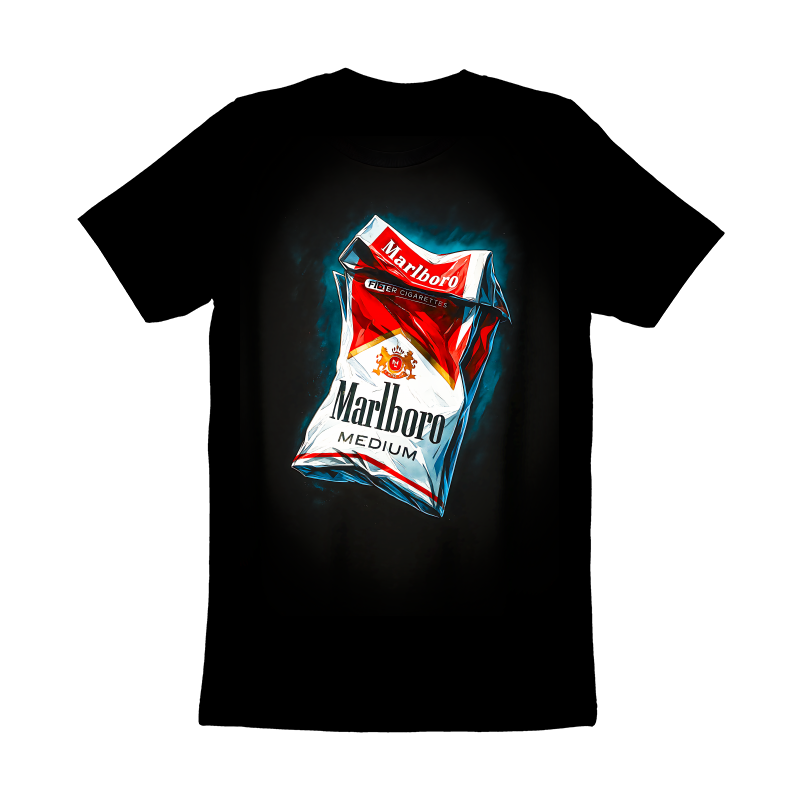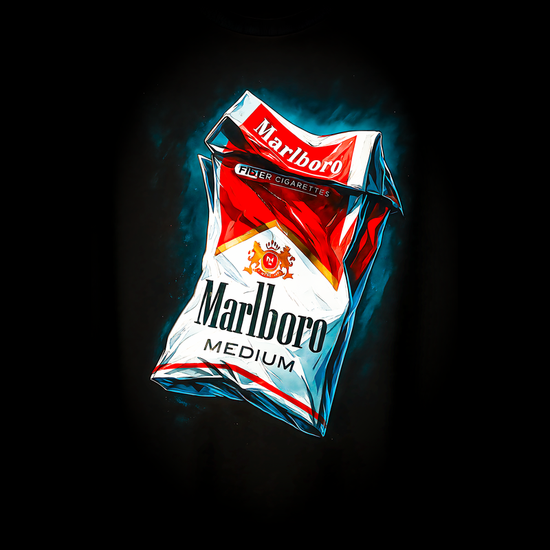 This artwork presents a stylized, pop art-inspired rendition of a Marlboro cigarette pack. The pack is depicted with dynamic, exaggerated folds and creases, giving it a sense of movement and energy. The iconic red and white color scheme of the Marlboro brand is prominently featured, enhanced with bold, contrasting shadows and highlights that create a striking visual impact. The background is a stark black, which makes the colors of the pack pop. The design has a painterly quality, with visible brushstrokes and a textured feel, reminiscent of street art or a hand-painted mural. This piece blends commercial imagery with artistic flair, resulting in a bold and eye-catching statement.