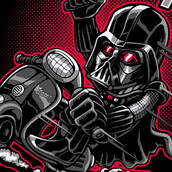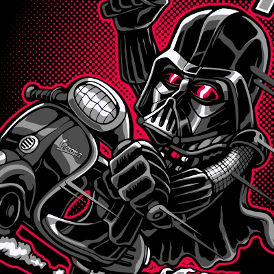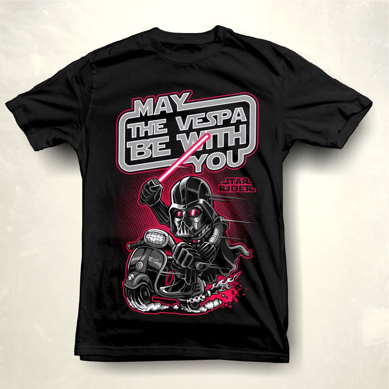 “May vespa be with you ” Cartoon style parody design. such as Ai,EPS,CDR, PDF and PNG Transparent. the design has 4 colors on black . print it can be used for digital printing and screen printing