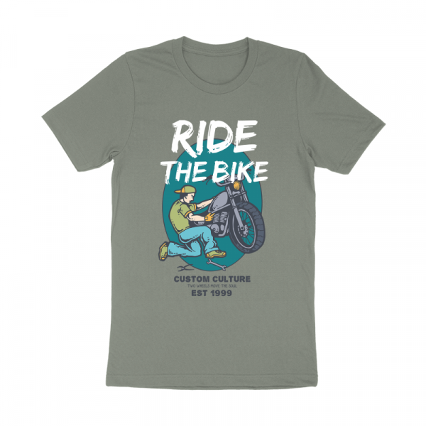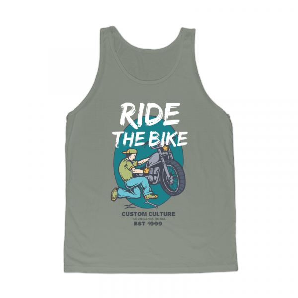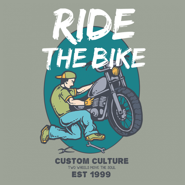 Vector illustration of a biker mechanic repiring his custom retro motorcycle in his garage. Ready to print on t-shirt.