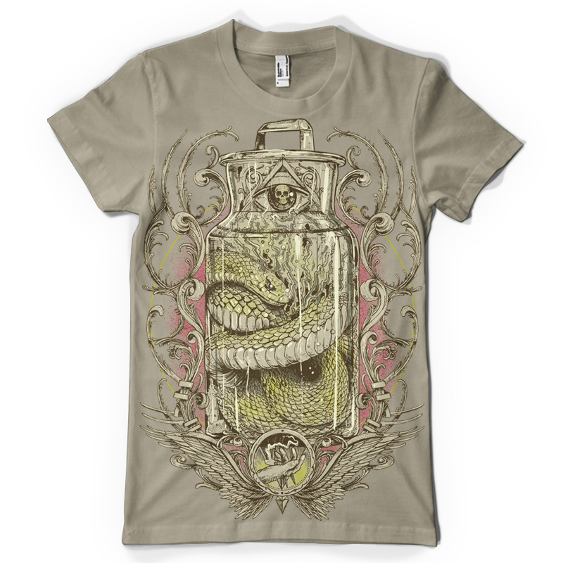 "Medicine Snake" T-shirt Design featuring a snake inside a jar. Design available in PSD format and can be used for digital printing and screen printing. The file will be available for , Adobe Photoshop.