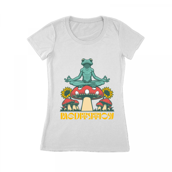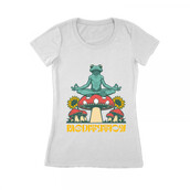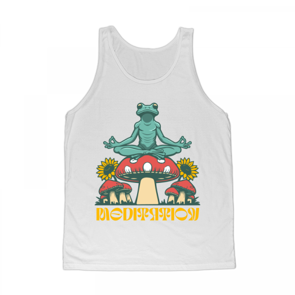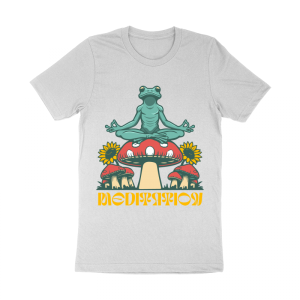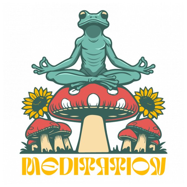 This enchanting and playful illustration features a meditative frog sitting in a perfect yoga pose atop a vibrant red mushroom, surrounded by sunflowers. The frog, with its calm expression and relaxed posture, embodies peace, mindfulness, and the joy of meditation. Its limbs are gracefully arranged in a classic lotus position, with its hands forming a mudra, symbolizing inner tranquility and spiritual focus. The mushroom, with its bright red cap and white spots, adds a whimsical touch, creating a fantastical scene that invites the viewer into a world of nature and serenity. The sunflowers flanking the mushroom bring a burst of cheerful yellow, enhancing the overall sense of happiness and well-being. This illustration is ideal for use in designs promoting meditation, yoga, wellness, and a connection with nature. Perfect for posters, apparel, and children's books, this delightful artwork is sure to captivate and inspire anyone who sees it, making it a standout piece for any collection.