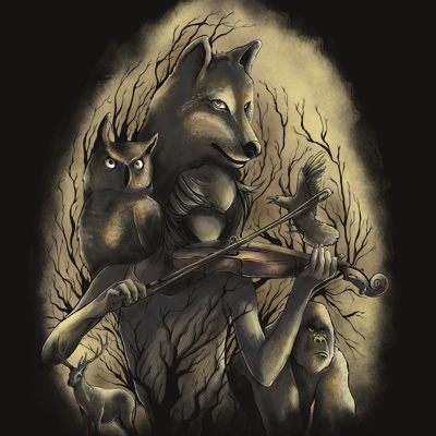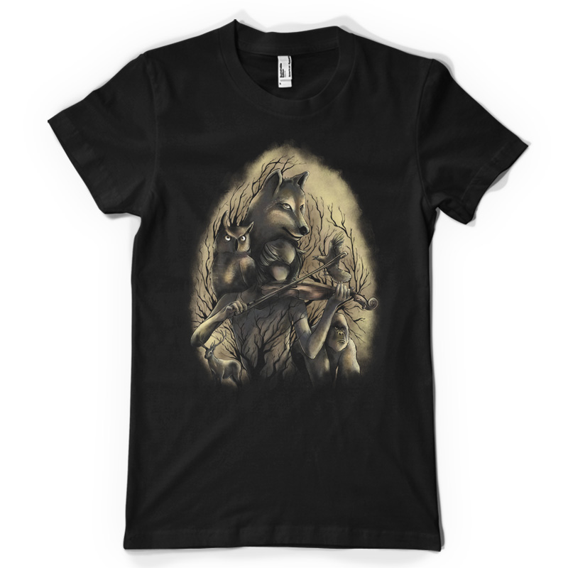"Midnight Music" is a unique illustration of different animals protecting the girl playing with her violin. This design is a combination of digital and traditional art. File contains a PSD file with 17x24 in size with 200 in dpi.