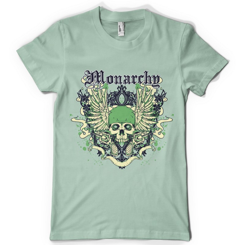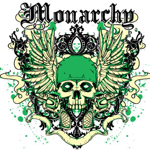 Monarchy graphic template in vector format, featuring detailed biker skull now available for Adobe Illustrator, Adobe Photoshop and Corel Draw and can be used for digital printing and screenprinting .