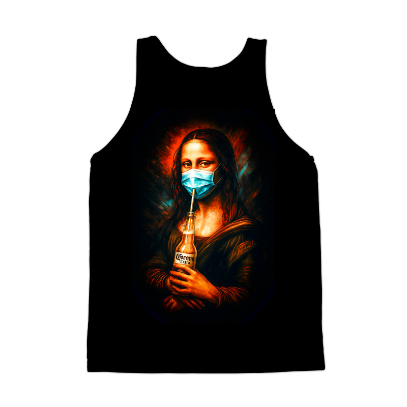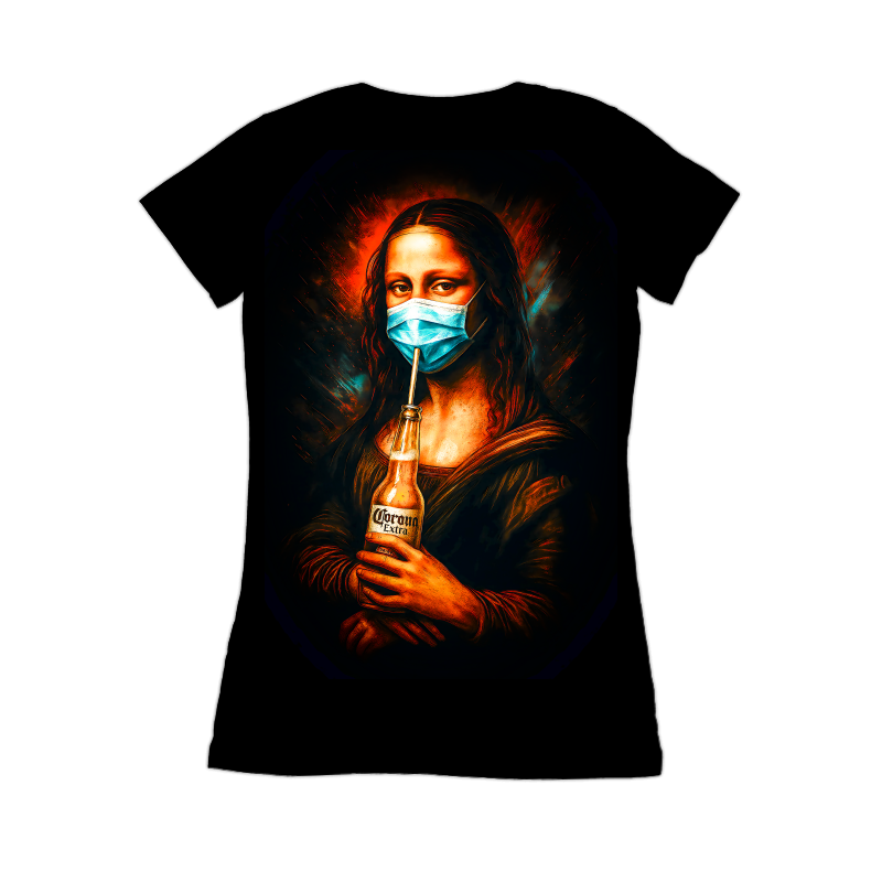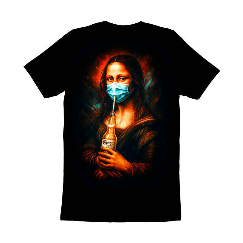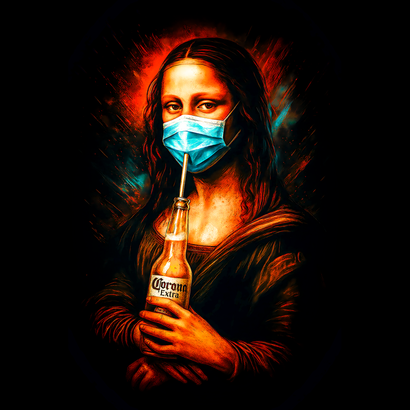 This design reimagines Leonardo da Vinci's iconic Mona Lisa for the modern era. She is portrayed wearing a blue surgical mask. Instead of a mysterious smile, she sips a Corona beer through a straw, a humorous and topical twist. The artwork retains the classic Renaissance style, with soft, subtle shading and a focus on realistic human features, but is updated with contemporary elements. The color palette is rich and warm, dominated by earthy tones with vibrant accents. The background features dynamic, swirling patterns that add a sense of movement and modernity to the classic portrait. The overall effect is a blend of high art and popular culture, creating a striking and memorable image. Designers could use this image for a variety of purposes, from creating humorous t-shirts and posters to designing eye-catching social media content. It would be perfect for COVID-19 related awareness campaigns, or as a satirical commentary on contemporary culture. The design's unique blend of classic art and modern themes makes it highly versatile and appealing to a broad audience.