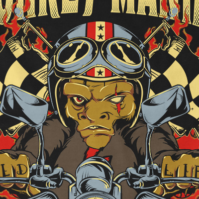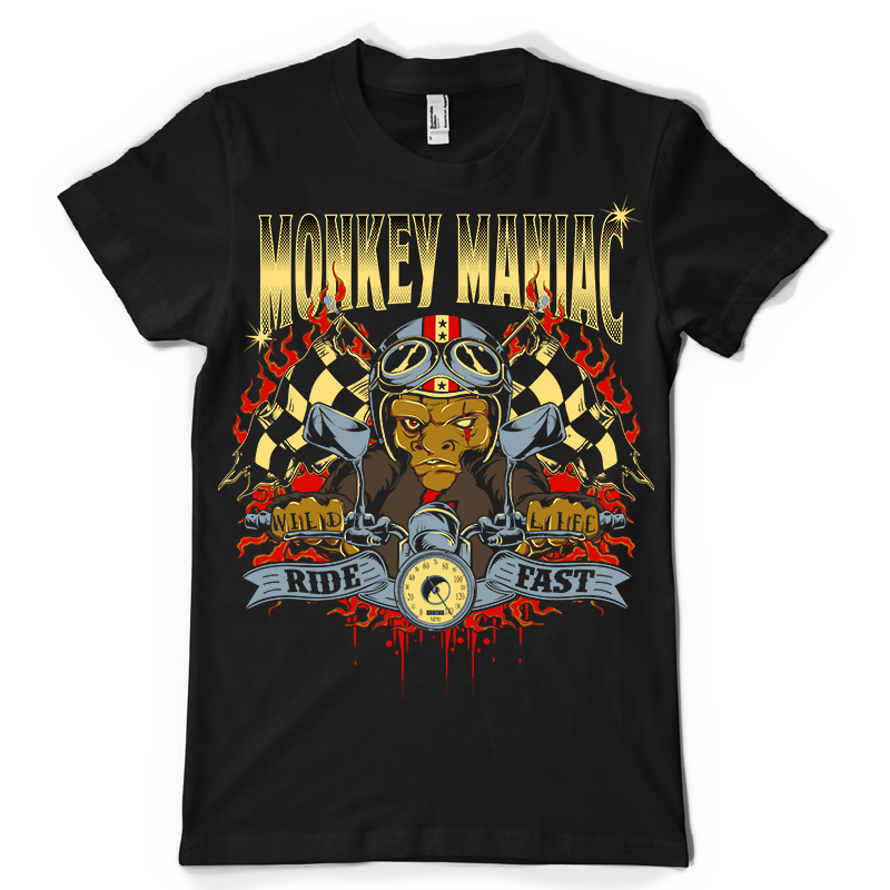 Monkey Maniac in Adversity design features a crazy biker detailed screen print now available for Adobe Illustrator, and Corel Draw and can be used for digital printing and screenprinting.