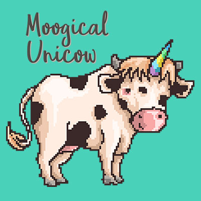 Moogical Unicow. Inspired from the retro video game box art and classic popular video games in the 80's era. Mixed with popular unicorn mythology. What's more funny than a cow with unicorn horn. This design made with pixel art illustration.