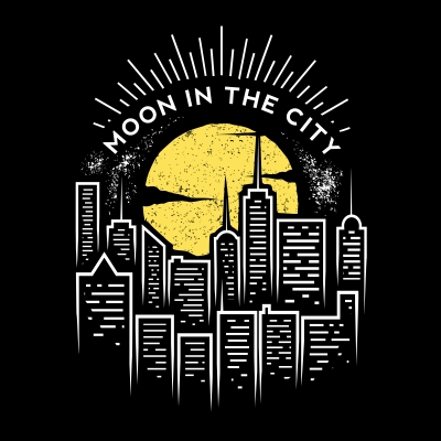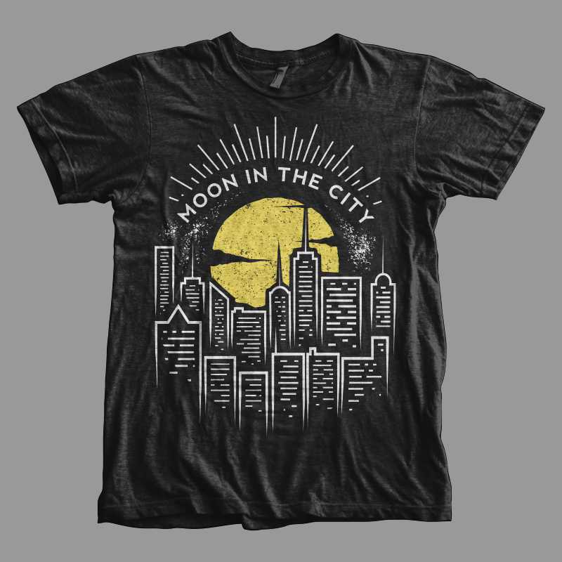 "Moon in the City" urban style t-shirt design. This design use 2 colors on black t-shirt. It's high quality vector format, easy for editing process. Available for Adobe Illustrator, PSD, PDF and can be used for digital printing and screenprinting.