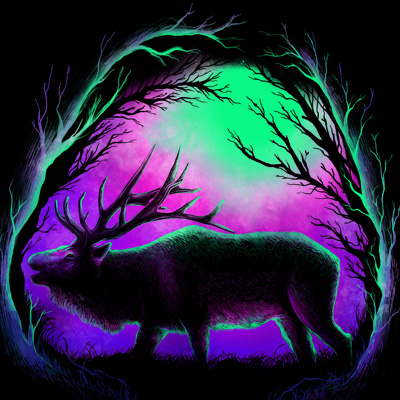 "Moonshine" is a unique illustration of an Elk in the middle of the forest with glowing moonlight shining to it with a combination of neon colors to make it more pop out. File contains a PSD file with 17x24 in size.