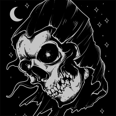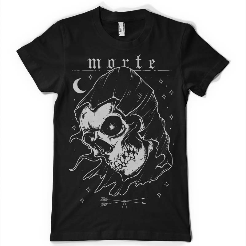 Morte t-shirt design in vector format.The artwork is featuring a vector skull design with a crescent moon and different elements .This is an Adobe Illustrator file, ready for print. Files included are Eps. The template can be used for digital printing and screenprinting.The file is well organised with every element on its own layer, including artwork, text and background.