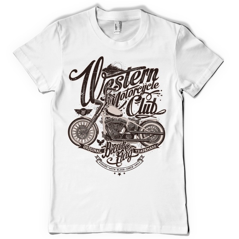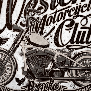 Motorcycle club printed t-shirt features a detailed screen print of retro motorcycle now available for Adobe Illustrator, Adobe Photoshop and Corel Draw and can be used for digital printing and screenprinting .