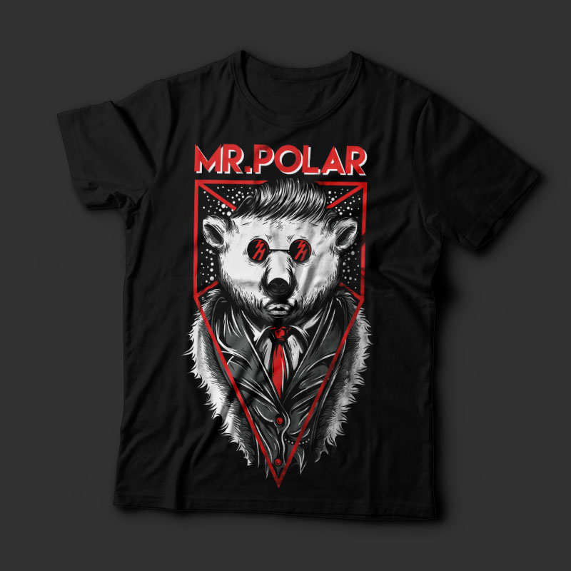 Mr.Polar included on Mafia Series. Cool vector design that looks great with combination around dark and red color. Based on vector file, easy to resize and edit. File features AI, EPS, and PNG all in zip, CMYK color mode and 4 colors print, 3 color in black t-shirt.