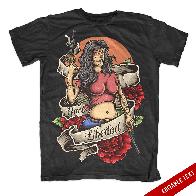 Vector illustration of muerto gangster woman holding gun with floral, rose, banner and editable text. Made with tattoo style design illustration. Ready to print on t-shirt.