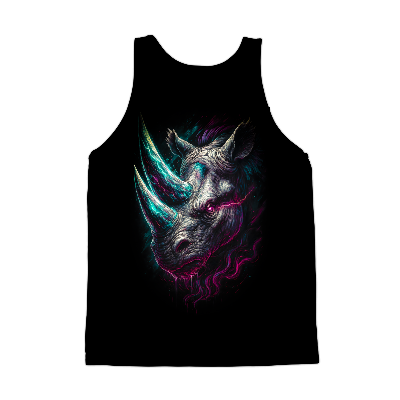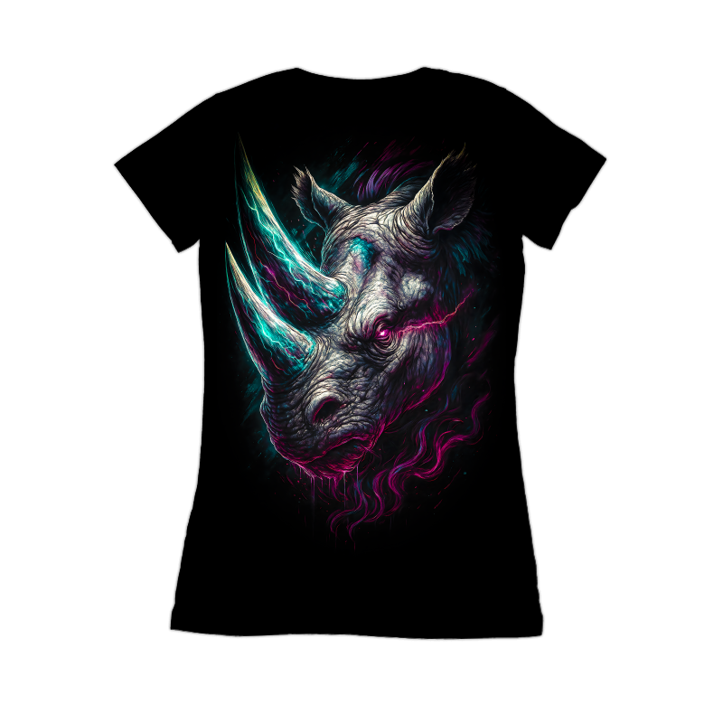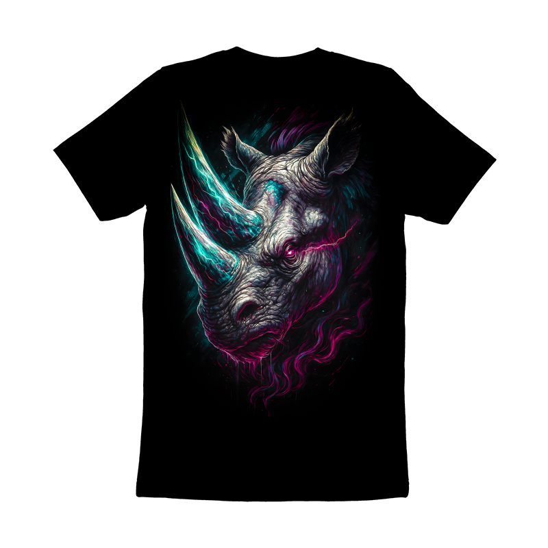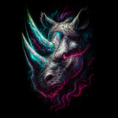 This design features a striking rhino head, rendered in a vibrant, neon-infused style. The rhino's hide is intricately detailed, showcasing a rough, textured surface that contrasts with the smooth, glowing energy emanating from its horns. Electric blue and magenta hues dominate, creating a visually arresting effect that suggests power and dynamism. The background is kept dark to emphasize the neon glow, making the rhino appear to leap off the canvas. The overall aesthetic blends elements of realism with a futuristic, almost cyberpunk vibe. This design would appeal to those seeking bold, eye-catching graphics with an edgy, modern twist. The dripping effect at the bottom adds a touch of the surreal, enhancing the design's unique character. The piercing red eye adds a sense of intensity and focus to the animal. Designers could use this graphic for apparel, posters, or digital art projects. Its bold style is perfect for branding edgy, urban products or music-related merchandise. The neon aesthetic would also lend itself well to gaming-related designs or promotional materials for electronic music events. It is versatile enough to be adapted for both print and digital media, making it a valuable asset for creative projects.