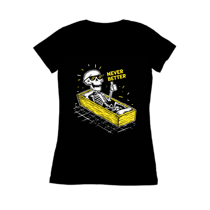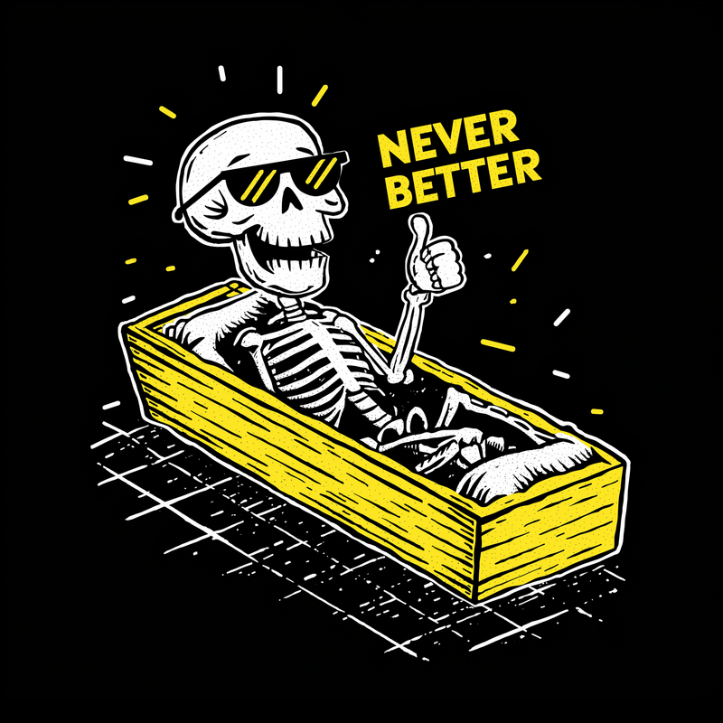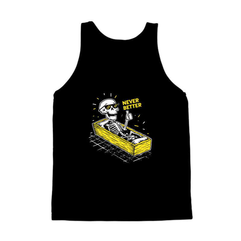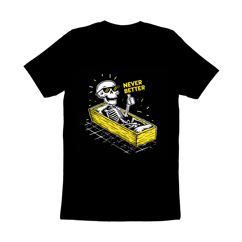 This design features a cartoon skeleton lying in a coffin, giving a thumbs-up. The skeleton is wearing sunglasses, adding a touch of cool to the morbid scene. The phrase 'Never Better' is written above the skeleton. The artwork is rendered in a bold, graphic style with thick lines and a limited color palette of black, white, and yellow. The coffin has a wood grain texture, and the background includes a simple grid pattern. The overall effect is humorous and slightly macabre, blending dark humor with a lighthearted aesthetic. The design is well-suited for apparel, posters, or other merchandise.