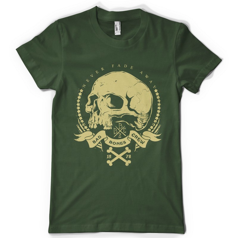 Never fade away digital design template in vector format, featuring detailed skull now available for Adobe Illustrator, Adobe Photoshop and Corel Draw and can be used for digital printing and screenprinting .