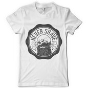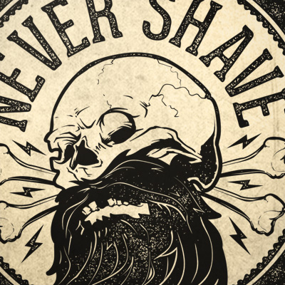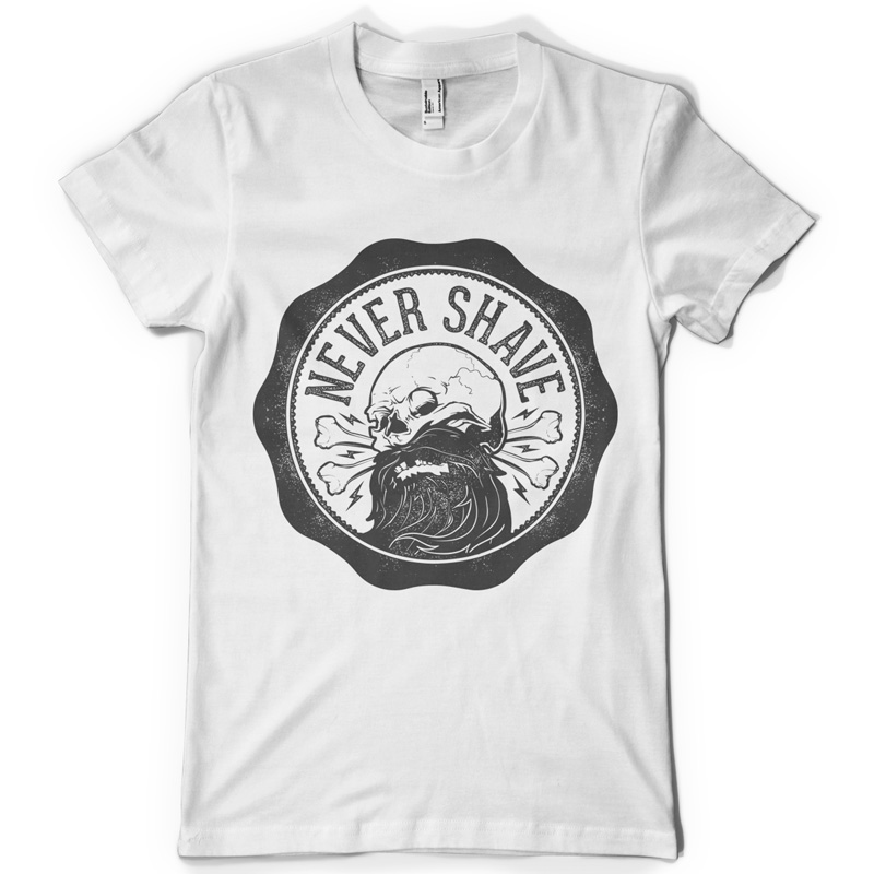 Never shave digital t-shirt design template in vector format, featuring detailed skull, with beard and bones in the background, now available for Adobe Illustrator, Adobe Photoshop and Corel Draw. The file can be used for digital printing and screenprinting.