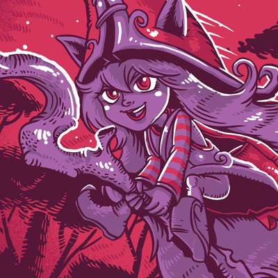 Night Flight t-shirt design featuring a young witch cartoon character, flying a broom in the forest.T-shirt Design is available only as Adobe Photoshop file at 300 DPI and can be used for digital printing and screenprinting.