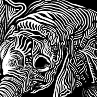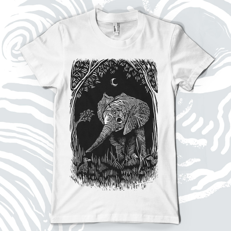 Night Life--is about an little african elephant cub strolling in the African night landscape. Rendered in pattern-like strokes with a simple one color.