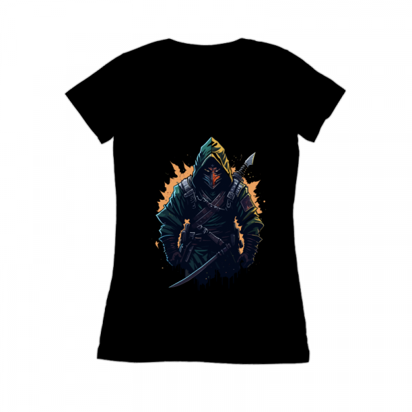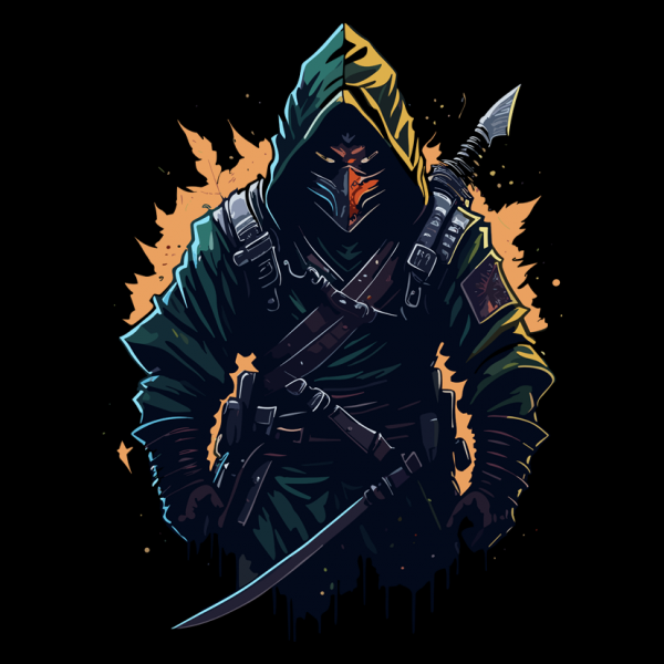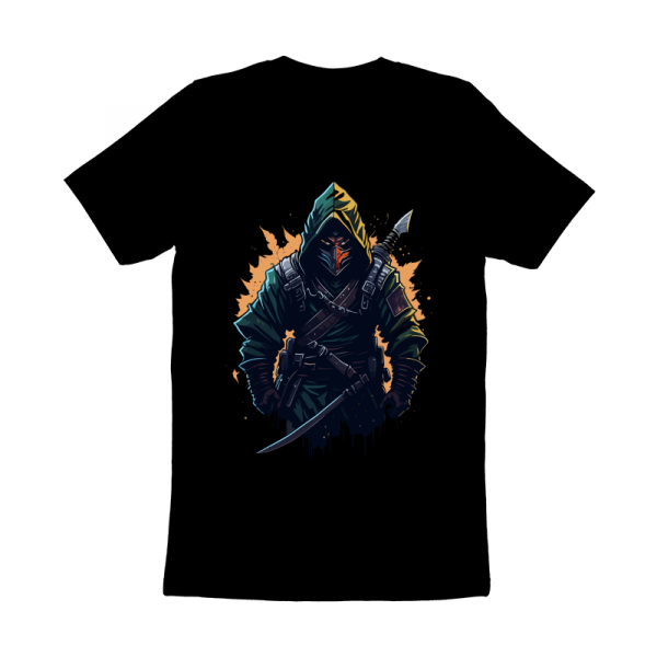 Ninja Assassin Artwork" for a t-shirt clothing design could feature a dynamic and stealthy ninja character in action. The ninja could be depicted in a classic pose, wielding traditional weapons like shurikens or a katana sword, surrounded by shadows and mist to create a sense of mystery and intrigue. The artwork would likely be rendered in a bold and striking style, using dark and moody colors to capture the essence of the ninja's covert and deadly abilities. This design would appeal to those who admire the mystique and skill of these legendary warriors and want to wear their legend with style