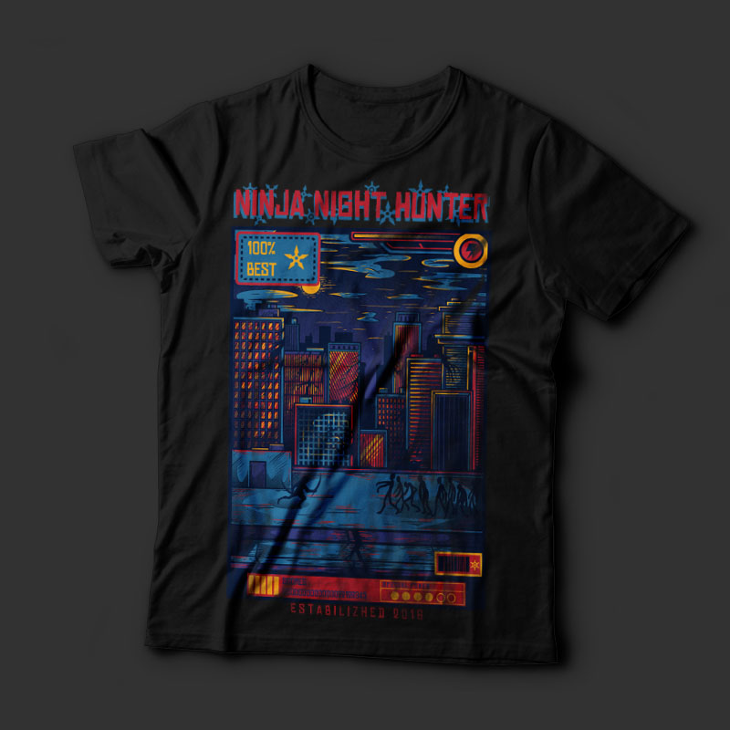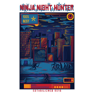 Ninja Night Hunter with Urban colorful and joyful style. Cool vector design that looks funny and joyfull. Based on vector file, easy to resize and edit. File features AI, EPS, and PNG all in zip, CMYK color mode and 6 colors print. font link included on readme file. Cheers!