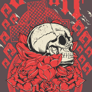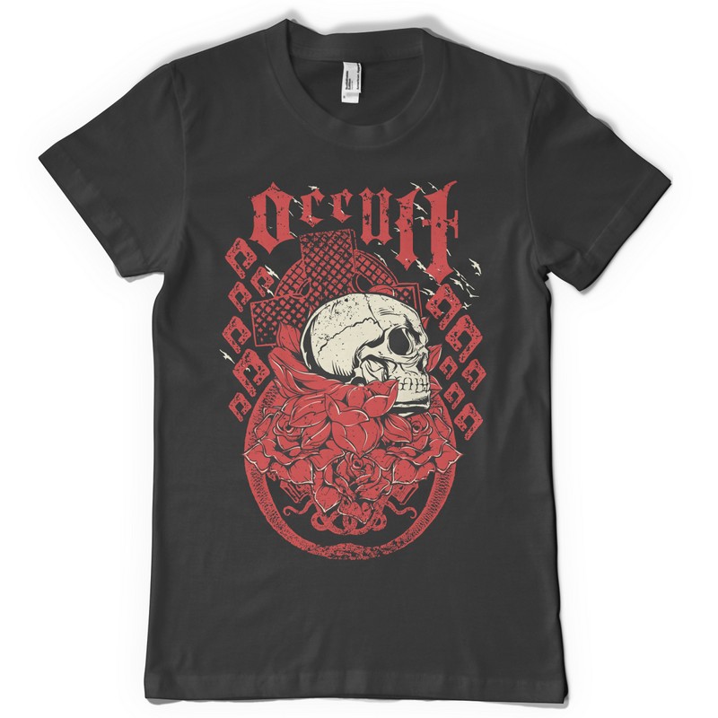 Occult Religion graphic design template in vector format, featuring detailed cross and skull now available for Adobe Illustrator, Adobe Photoshop and Corel Draw and can be used for digital printing and screenprinting .