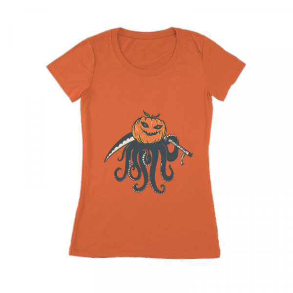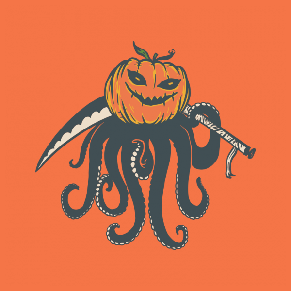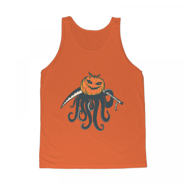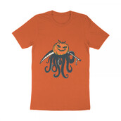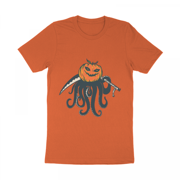 Octopus Pumpkin Reaper Halloween is a vintage illustration that is suitable for apparel or merchandise about octopus, squid, animal fish, halloween, pumpkin, samurai, horror, kraken, sea.