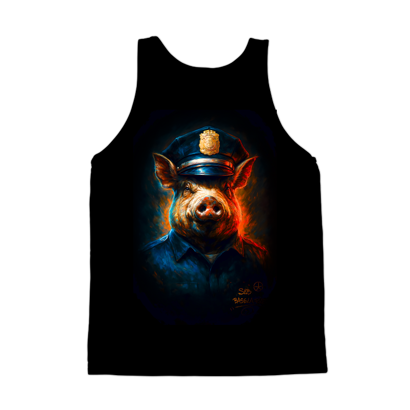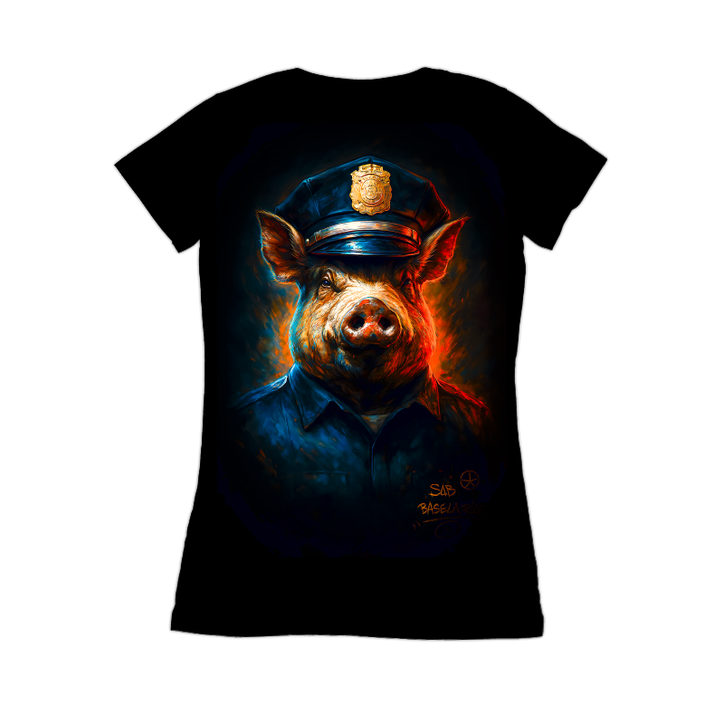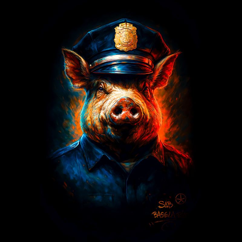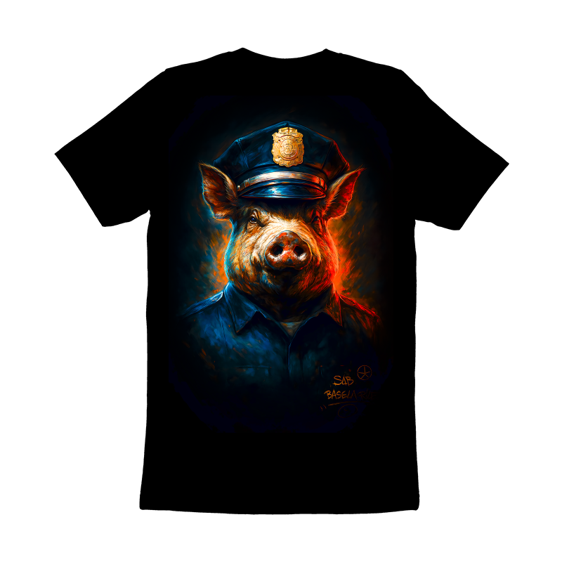 This striking design features a pig's head superimposed on a police officer's uniform, creating a visually arresting and thought-provoking image. The pig, rendered with realistic detail and expressive eyes, wears a classic police cap adorned with a golden badge. The use of light and shadow is masterful, highlighting the texture of the pig's skin and the crispness of the uniform. The color palette is rich and vibrant, with blues and oranges creating a dynamic contrast. The background is dark, further emphasizing the central figure. The overall effect is both humorous and slightly unsettling, inviting viewers to contemplate themes of authority, corruption, and societal roles. The artist's signature is subtly placed at the bottom, adding a personal touch to the artwork. Designers could use this image for a variety of purposes, including t-shirt designs, posters, and editorial illustrations. It would be particularly effective for projects that aim to provoke thought or challenge conventional ideas. Its edgy and unconventional style makes it suitable for targeting niche audiences interested in counter-culture or political satire.