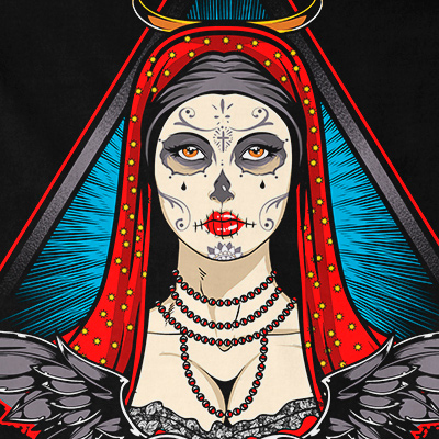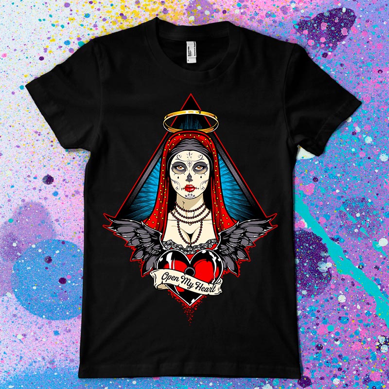 Open My Heart later t-shirt design features a catrina design detailed screen print now available for Adobe Illustrator, Adobe Photoshop and can be used for digital printing and screenprinting.