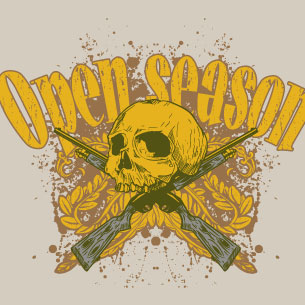 Digital design featuring detailed skull and two guns prepared for the open season . Open season t-shirt template is available in vector format and can be used as a digital printing and screenprinting. The file will be available for Adobe Illustrator, Adobe Photoshop and Corel Draw.