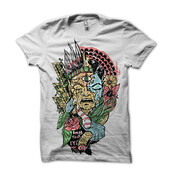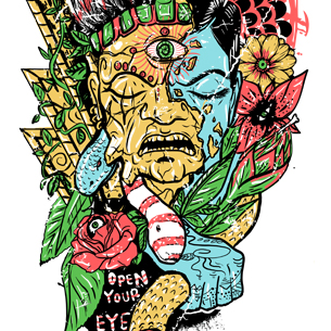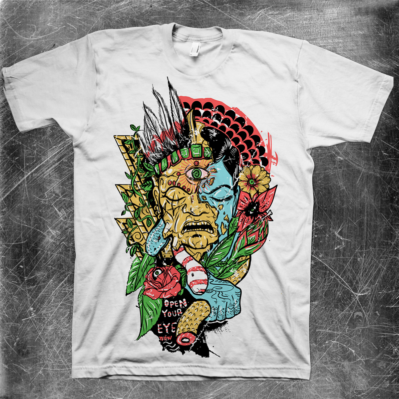 Open your eye printed t-shirt features a detailed screen print of creepy double face mask available in two color design created in Adobe Illustrator and can be used for digital printing and screenprinting .