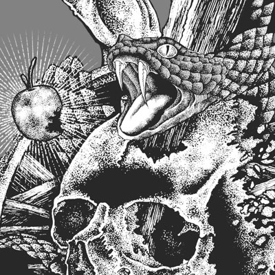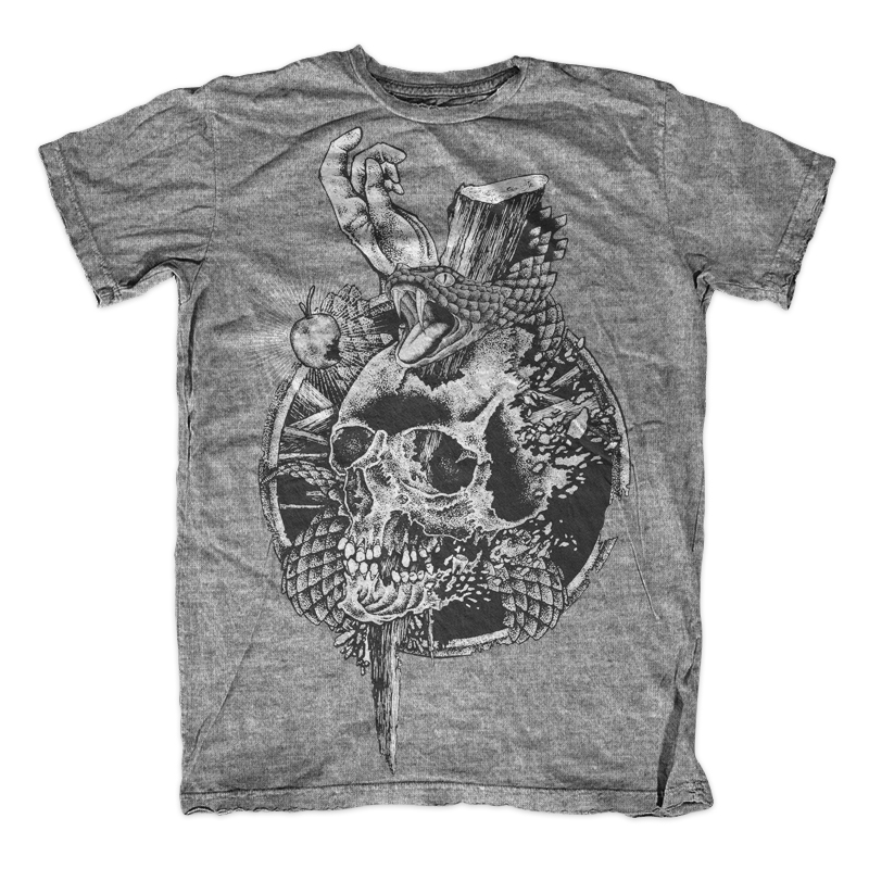 Illustration of skull, snake, hand and forbidden fruit based on genesis bibble. The illustration told about first original sin. Made with hand drawing and tattoo style design. Ready to print on t-shirt.