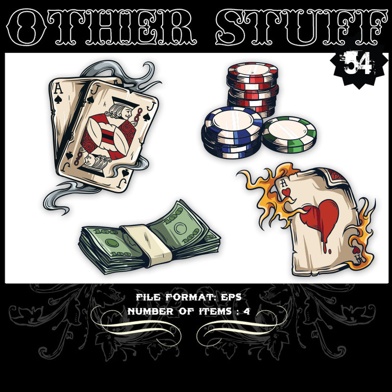 Other Stuff 54 - Gambling, vector set featuring gambling elements such as playing cards, wad of cash, playing chips and flaming card. The file will be available AI and EPS formats.