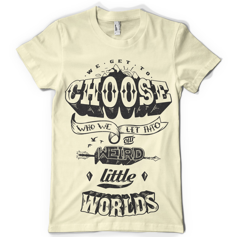 "Our weird little worlds" T-shirt design featuring typography style print with a movie quote, from Good Will Hunting, with hand drawn details. The files available are suitable for Adobe Illustrator, Adobe Photoshop and Corel Draw and can be used for digital printing and screenprinting.