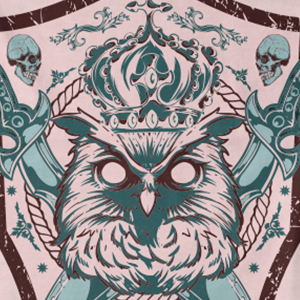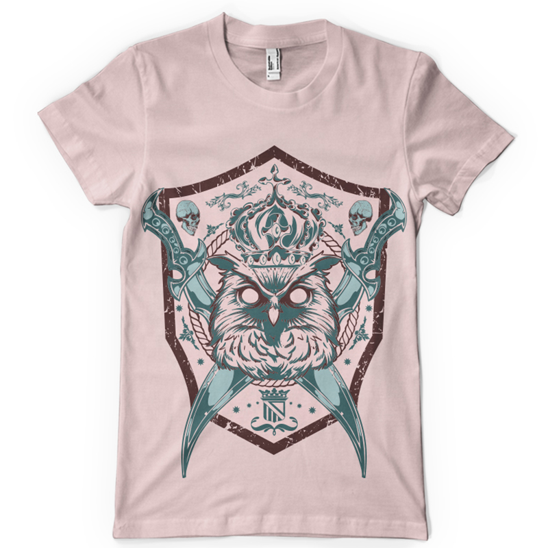 Owl king printed t-shirt features a detailed screen print of a owl shield is now available in EPS format file and can be used for digital printing and screenprinting . Ready to print or use in anything you want.