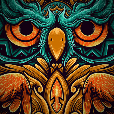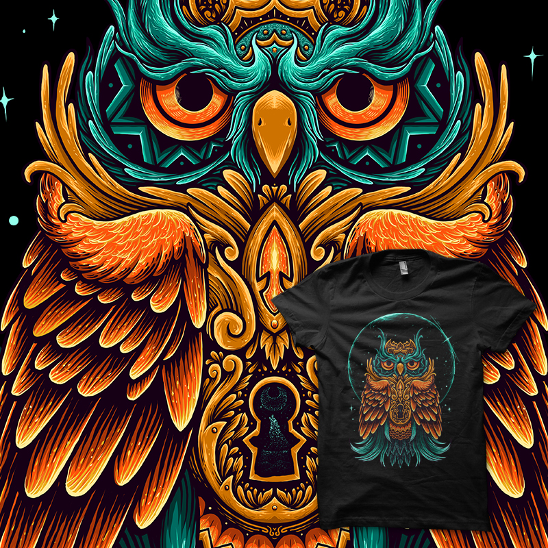 OWL ORNAMENT SHINE FIRE best artwork more details and colorful. Awesome owl with ornament, feather like a fire and silhouette moon and stars.