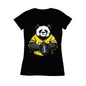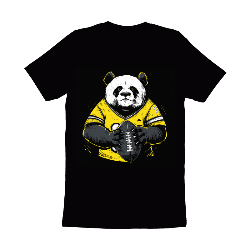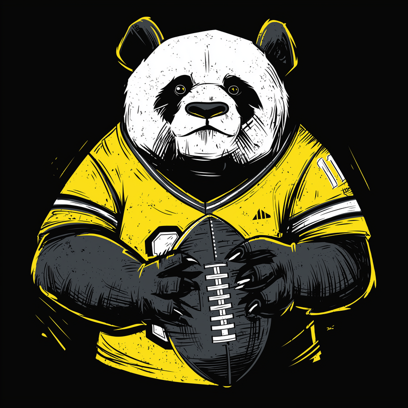 This striking design features a panda bear dressed in a yellow and grey football uniform, complete with the number '11' on the shoulder. The panda is holding an American football, its claws gripping the ball tightly. The artwork is rendered in a bold, graphic style with strong lines and a limited color palette, creating a visually impactful image. The black background emphasizes the panda's contrasting colors and adds a modern touch. The design blends the cuteness of a panda with the intensity of American football, resulting in a unique and eye-catching piece. The style is reminiscent of vintage sports posters with a contemporary twist.