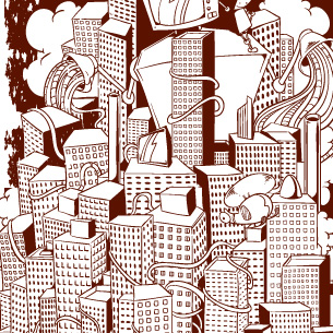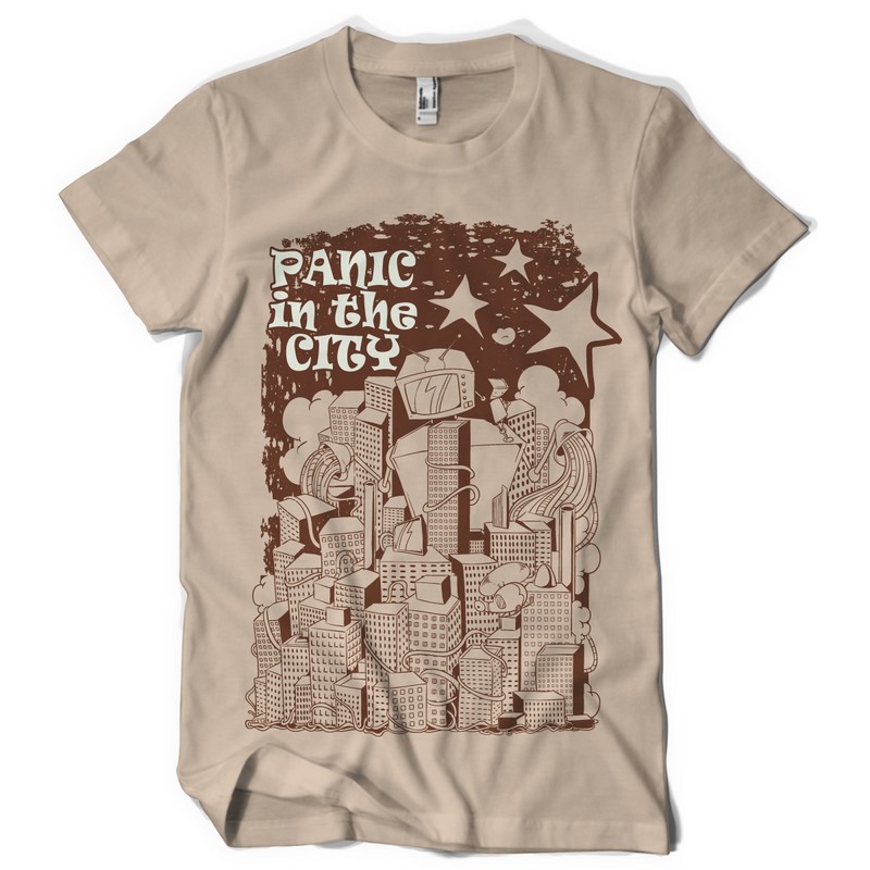 Panic the city digital design in vector format, featuring detailed funky town now available for Adobe Illustrator, Adobe Photoshop and Corel Draw and can be used for digital printing and screenprinting .