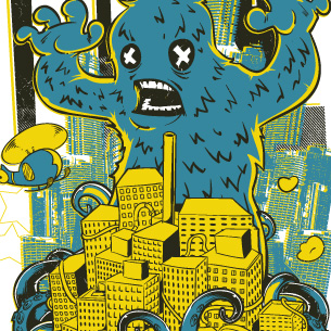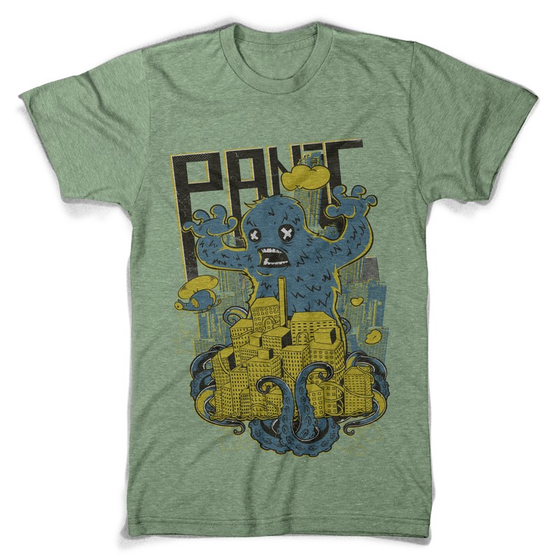 Panic monster graphic design template in vector format, featuring detailed creature attacking the city now available for Adobe Illustrator, Adobe Photoshop and Corel Draw and can be used for digital printing and screenprinting .