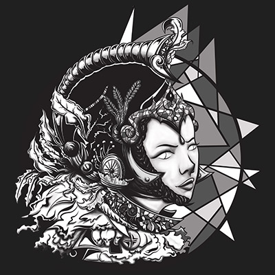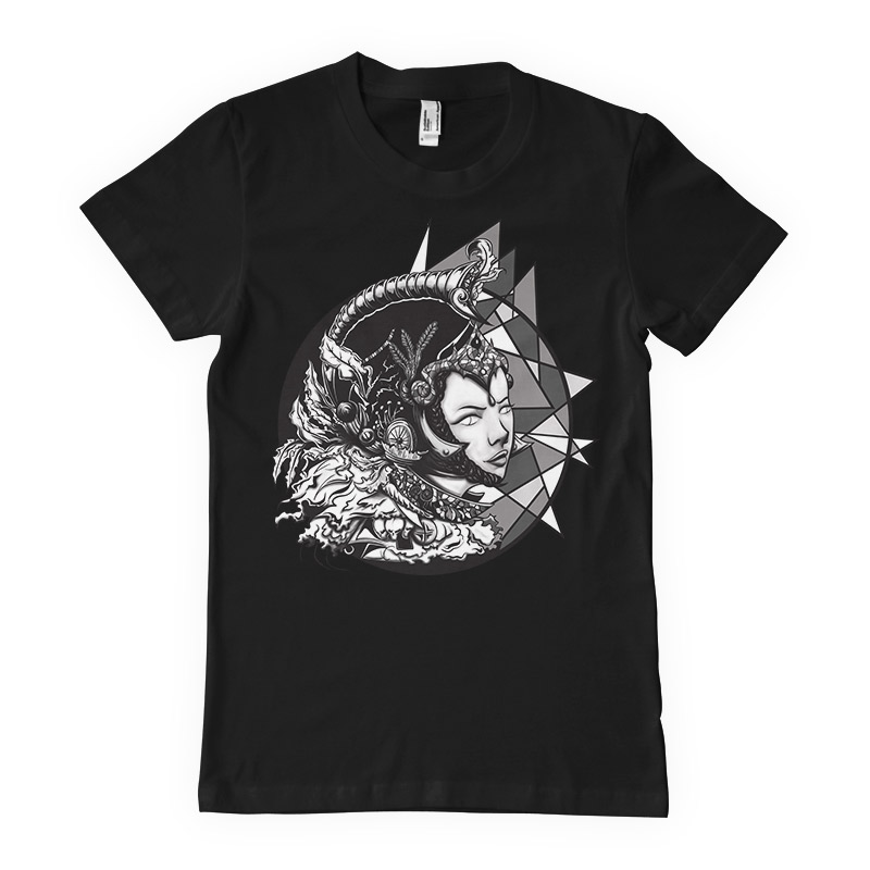 Paragon Girl T-Shirt Design. Digital illustration featuring detailed parpgon girl with helmet, plumes and skulls. The image is white and black with different grey colors.The source file is available in PNG format.
