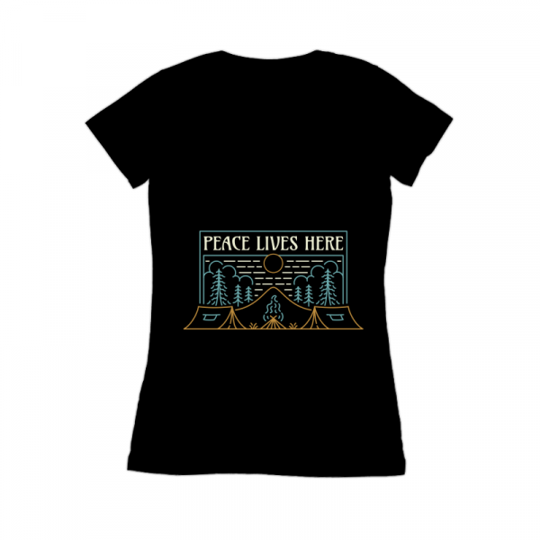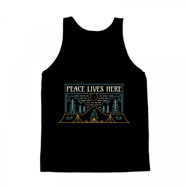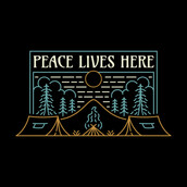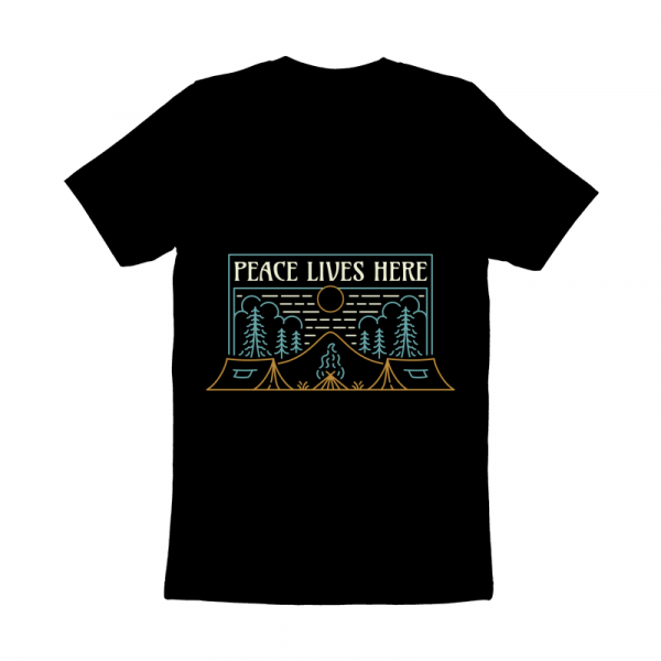 Peace Lives Here is a monoline illustration that is suitable for apparel or merchandise about nature, outdoors, adventure, summer, vacation, holiday, camping, camper, backpacker, tent, hiking, mountain, national park, wildlife, campfire.