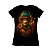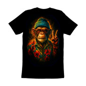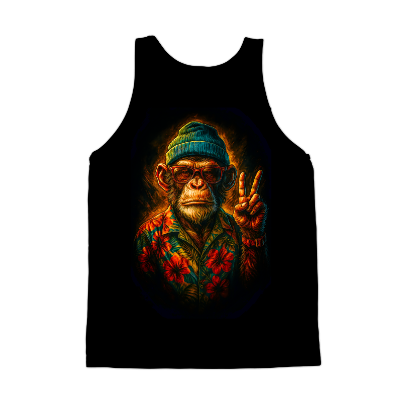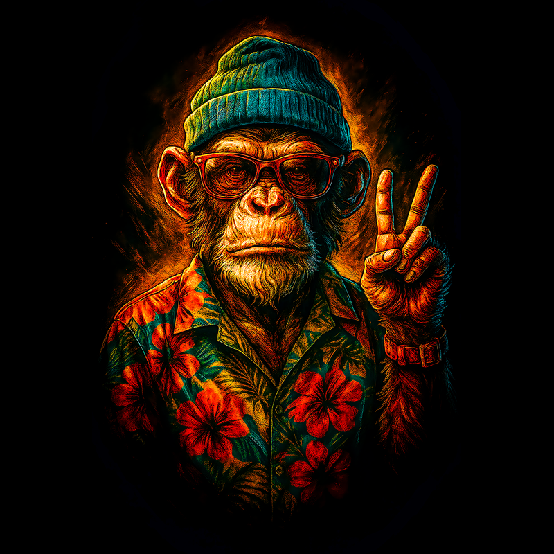 This striking design features a chimpanzee exuding cool vibes. The chimp is depicted wearing a teal beanie and red-framed glasses, giving it an intellectual, hipster look. Adding to the laid-back aesthetic, the chimp sports a vibrant Hawaiian shirt with red hibiscus flowers and green foliage. The chimp is throwing a peace sign. The artwork is rendered in a style reminiscent of neo-expressionism, with bold outlines and a vivid color palette that creates a visually arresting image. The background is a dark gradient, which makes the colors pop. This design balances playful charm with a touch of edgy sophistication. Designers could use this image for a variety of projects, from t-shirt designs and posters to stickers and social media graphics. Its cool and quirky appeal would make it a hit with younger audiences, especially those interested in streetwear, pop culture, and animal-themed designs. The image's vibrant colors and detailed rendering make it suitable for both digital and print applications.