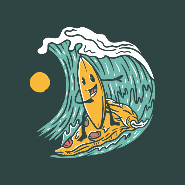 Pizza Surfing Board is a vintage illustration that is suitable for t-shirts, jackets, or merchandise with the theme of summer, beach, holiday, tropical, surfing, vacation, sea, food, italian, pizza, cheese, pepperoni, delicious, mozzarella, restaurant.