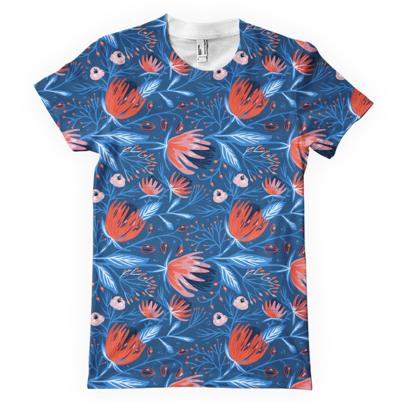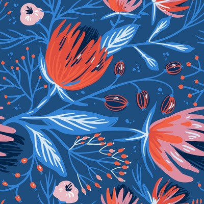 Vector floral seamless pattern with exotic blooms on a blue background.This image is a vector illustration and can be scaled to any size without loss of resolution.This image will download as a .eps file.