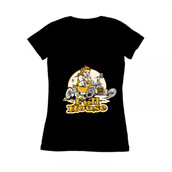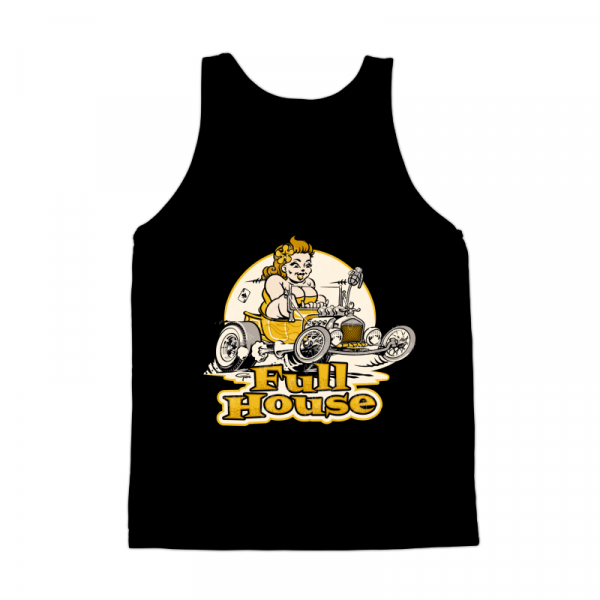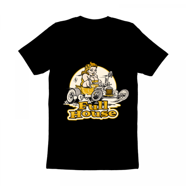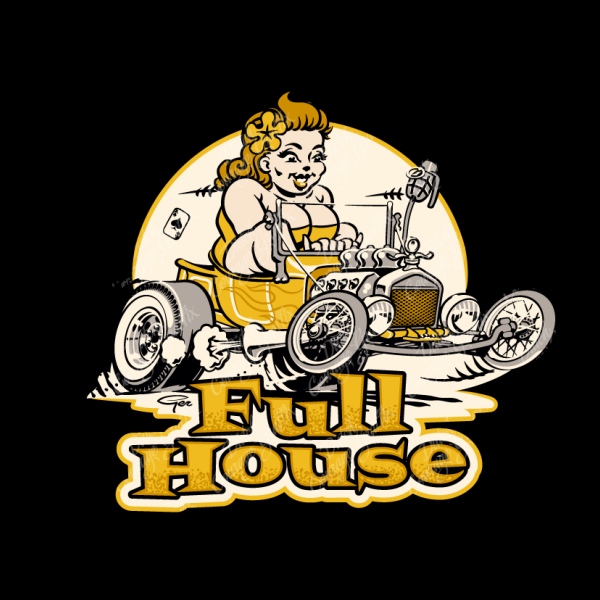 Plus-size rockabella pinup girl in hot rod T-bucket “Full House” - cartoon - vector illustration