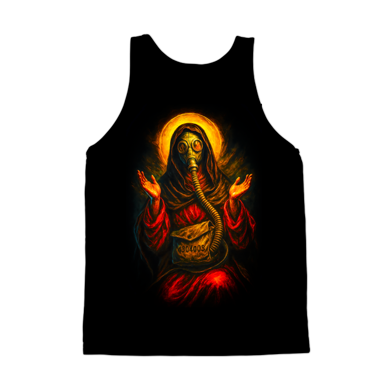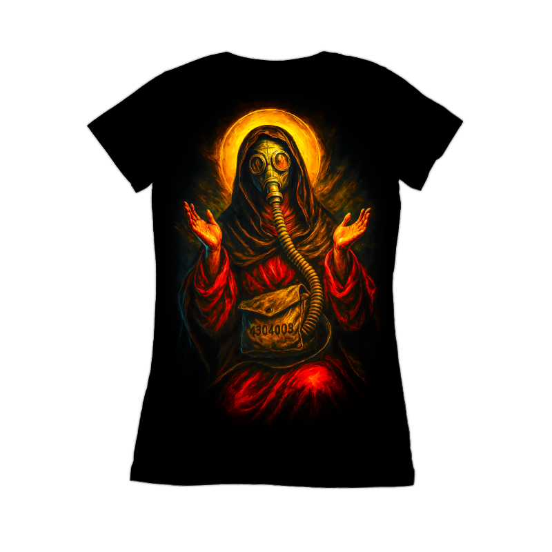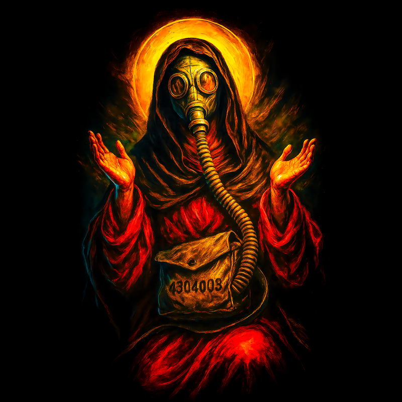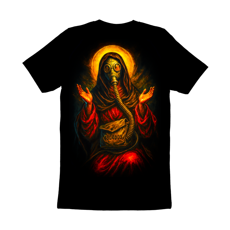 This design merges religious iconography with a dystopian, post-apocalyptic aesthetic. The central figure, reminiscent of a saint, is garbed in robes but wears a gas mask, creating a striking contrast between the sacred and the profane. A halo glows behind the figure, juxtaposed with the harsh reality of the gas mask and a bag with a numerical code, possibly symbolizing identification or a mark of survival in a ravaged world. The color palette is rich, with deep reds and oranges that evoke both warmth and danger. The overall effect is a powerful commentary on faith and survival in the face of environmental or societal collapse, blending elements of horror and religious art. Designers could use this for striking apparel designs, particularly for the alternative or streetwear markets. It would also work well for album art, posters, or even as a unique logo for brands with an edgy or apocalyptic theme. The design's blend of religious and dystopian elements makes it versatile for various media.