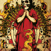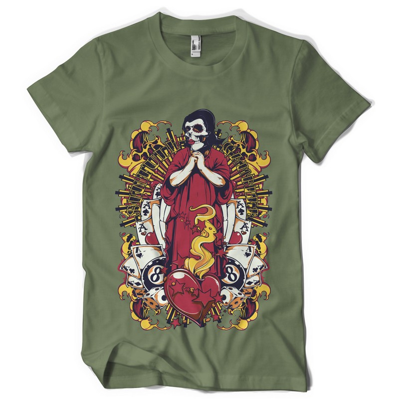 Pray for luck digital design template in vector format, featuring detailed praying skull now available for Adobe Illustrator, Adobe Photoshop and Corel Draw and can be used for digital printing and screenprinting .